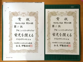 上の写真のような感じで複製いたします。どうですか?右側の原本が撮影者の影が出てしまって少し暗めに写っておりますが、 ほぼほぼ元版通りの仕上がりと自負しております。こちらのミニバス少年団様は大変好成績を収められたようで、5枚の賞状を10枚ずつご注文をいただきました。